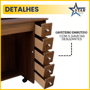 Organização: 5 gavetas amplas para guardar linhas, agulhas e acessórios.